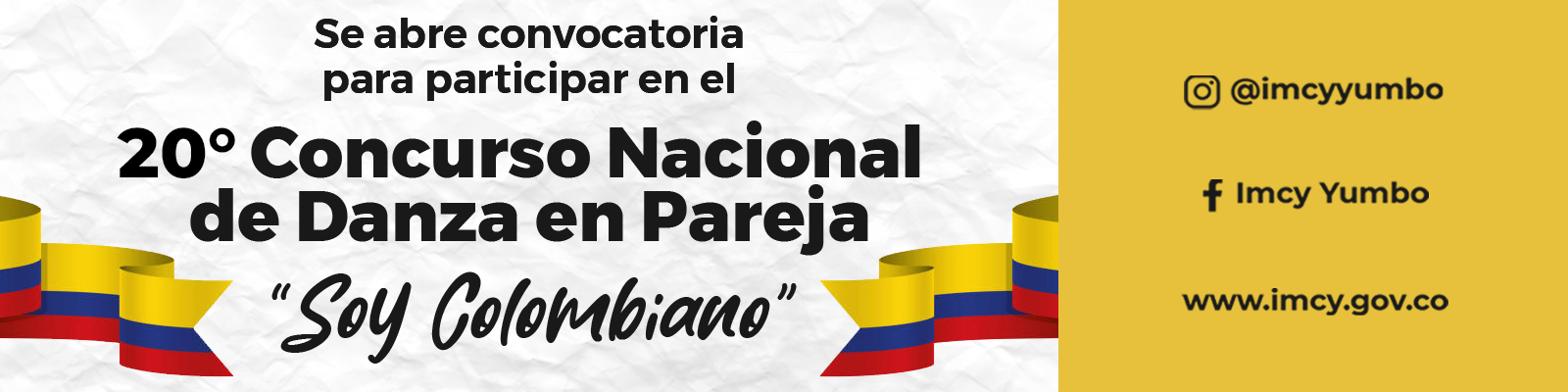 El Instituto Municipal de Cultura de Yumbo (IMCY) en cabeza de su Gerente, Dr. John Sebastián Echeverri Collazos invitan a participar en la vigésima edición del Concurso Nacional de Danza en Pareja «Soy Colombiano».